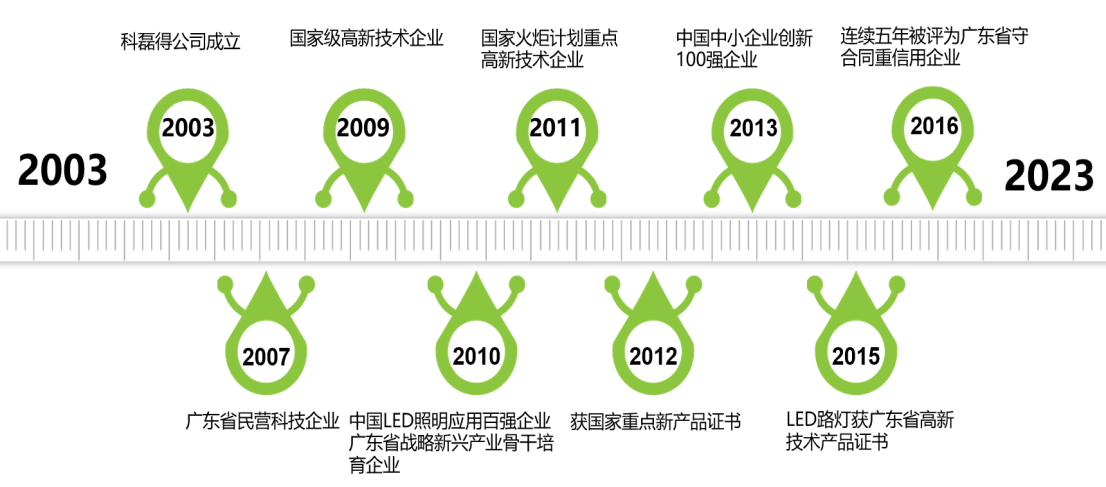 公司自2003年成立以来,一直致力于 LED 元件封装和 LED 照明类产品的研发,业已成为国内 LED 封装工艺和行业领先的 LED 照明企业,截止目前,公司已投入研发经费5000多万,公司多款产品拥有自主知识产权,申请专利85项,已授权75项,其中发明专利10项。公司与中国科院半导体所、复旦大学长期合作。开发的大功率 LED 路灯,无论在散热技术方面还是配光技术方面,均已遥领先于国内外同行水平,科磊得产品在北京故宫、中科院、清华大学校园、八仙广场、天津、邢台、安阳、益阳、阳泉、淄博、鄂尔多斯、乌海、大连、西安、成都、重庆、南宁、哈尔滨、东莞、深圳、惠州、佛山、江门、茂名等客户单位建立效果良好的项目工程,产品受到社会一致好评。近年来,科磊得产品在欧美及亚非多国均有地区经销商。