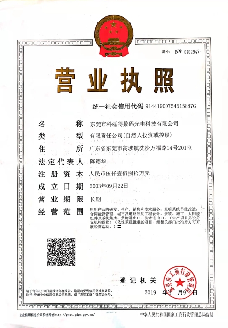 东莞市科磊得数码光电科技有限公司,位于东莞市高埗镇,是国家级高新科技企业,同时也是北京清华工业开发研究院的成果孵化基地,生产基地位于广东省东莞市高地镇洗沙管理区。注册资金5180万元,员工100余人,技术人员22人,占地3000多平方米。