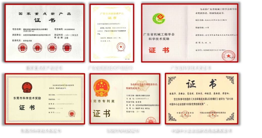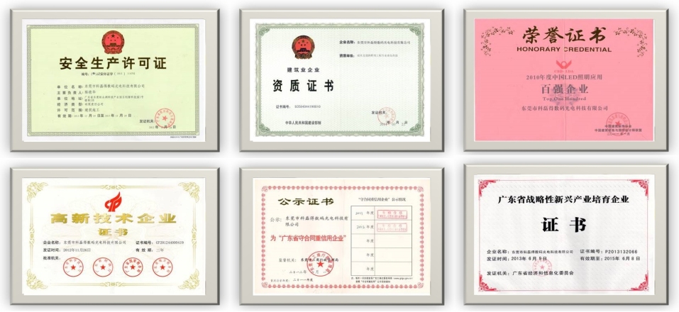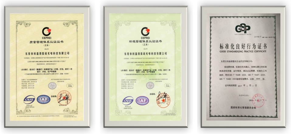 公司对产品质量严格把控,产品通过了 CE 认证、 RoSH 、 UL 认证,公司通过了ISO9001质量管理体系和ISO14001环境管理体系认证:通过了 CQC 认证体系。2006年被评为"东莞市民营科技企业",2007年被评为"广东省民营科技企业"。2009年获得"广东省节能产品标志",并进入"广东省高新技术产品"目录;2010年获"广东省自主创新产品","广东省战略新兴产业骨干培育企业"并被评为"标准良好行为 AAAA "企业,产品进入"广东省绿色照明示范城市荐采购产品"目录。2011年《东莞市半导体照明应用示范工程优先采购产品清单(2011年5月)》,拥有"城市及道路照明工程专业承包叁级"资质,获"国家火炬计划重点高新技术企业"称号:2012年 LED 路灯系列通过了国家质量认证中心的节能认证:2013年获得中石油华北油田分公司市场准入证:2015年获得国家"高新技术企业"称号,连续四年被评为"广东省守合同重信用企业"。